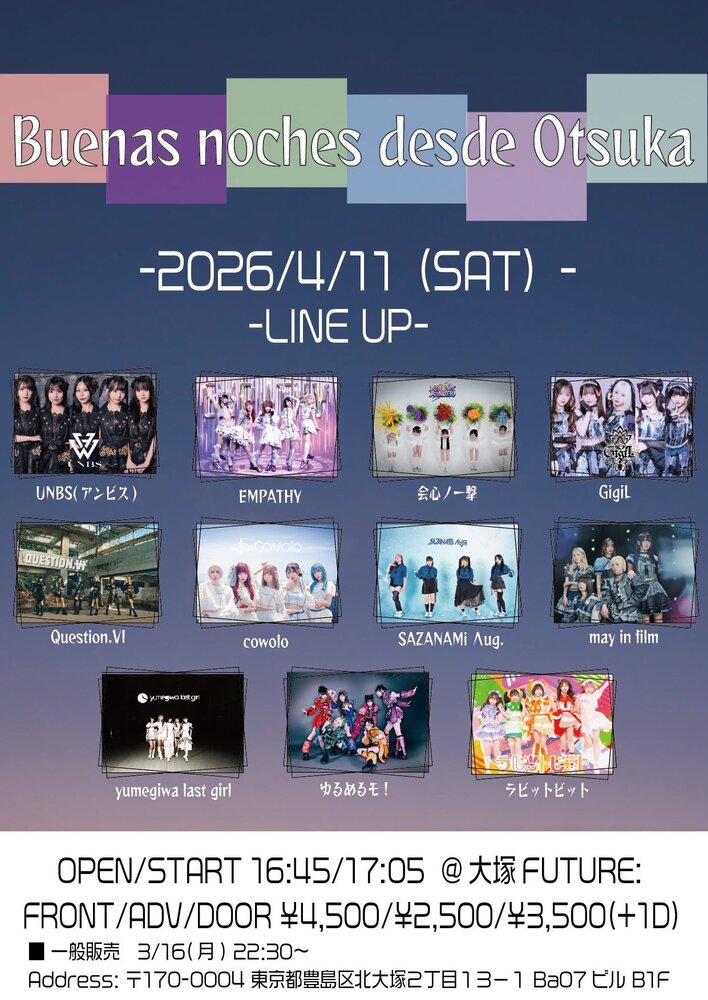 『Buenas noches desde Otsuka.〈NIGHT公演〉』 SCHEDULE 2026/04/11(土) 大塚FUTURE ⏰OPEN16:45 / START17:05🔔前方¥4500 / 一般¥2500(各+1D) チケット URLをコピーする 報告する