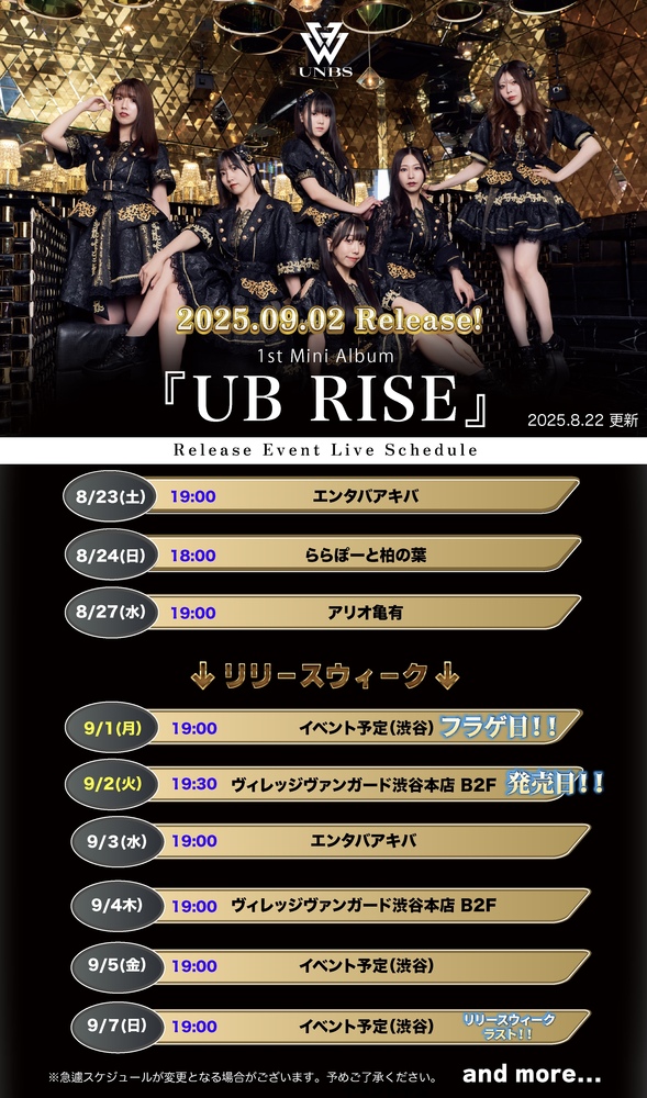 1st Mini Album『UB RISE』リリースイベント SCHEDULE 2025/09/04(木) 19:00 - 23:59 ヴィレッジヴァンガード渋谷本店B2F 📣観覧無料 ⏰19:00 START 17:30 CD販売開始 18:30 集合 19:00 ライブ 19:30 特典会 詳細 URLをコピーする 報告する