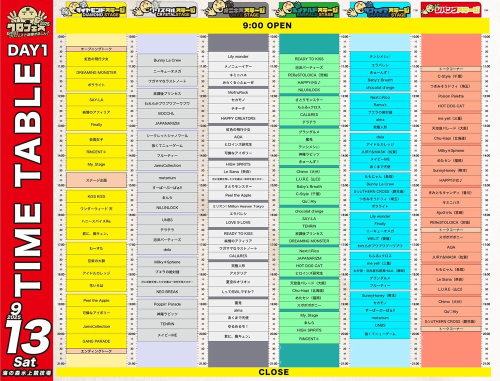 『クロフェス2025』 SCHEDULE 2025/09/13(土) 16:00 - 23:59 海の森水上競技場 ❶ 🎤クリスタル16:00-(20) 👑特典会16:40-18:00(7) ❷ 🎤サファイア19:35-(15) 👑特典会19:50-21:10(31) チケット URLをコピーする 報告する