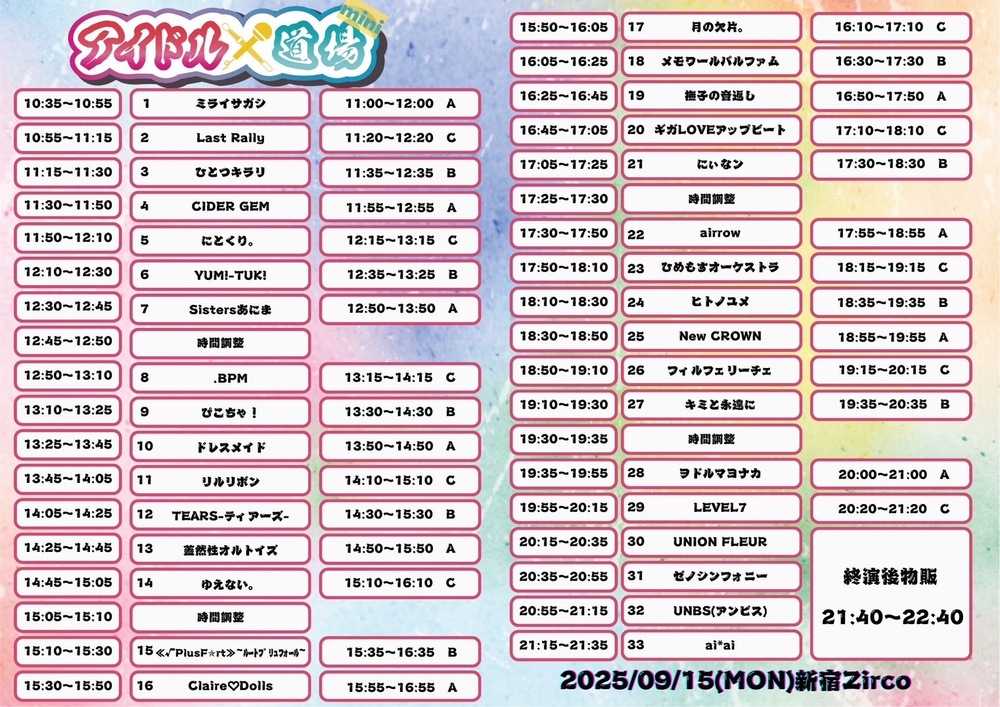 『アイドル道場 mini』 SCHEDULE 2025/09/15(月) 20:55 - 23:59 zirco tokyo Open/Start 10:15/10:35 前方チケット ¥4,000- 一般チケット ¥2,500- 🎤出演20:55-(20) 👑特典会終演後21:40-22:40 チケット URLをコピーする 報告する