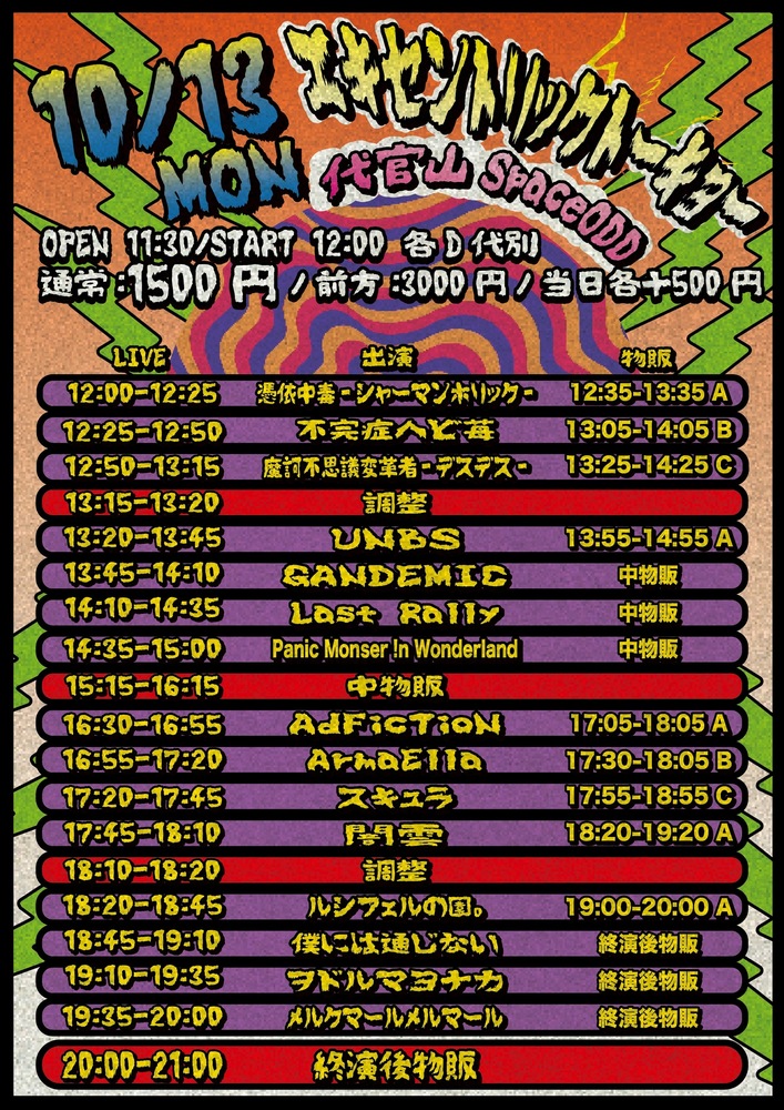 『エキセントリックトーキョー』 SCHEDULE 2025/10/13(月) 13:20 - 23:59 SPACE ODD 時間:OPEN11:30 / START 12:00 料金:予約:¥1500(D代別)/当日:各+¥500(D代別) 前方優先:¥3000 🎤出演13:20-(25) 👑特典会13:55-14:55 チケット URLをコピーする 報告する
