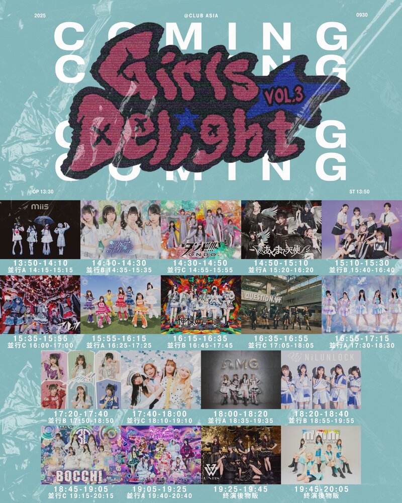 『GirlsDelight Vol.3』 SCHEDULE 2025/09/30(火) 19:25 - 23:59 Club asia 開場13:30/開演13:50 前売券1,000円/当日券2,000円 ※再入場可(1D代) 🎤出演19:25-(20) 👑特典会終演後20:10- チケット URLをコピーする 報告する