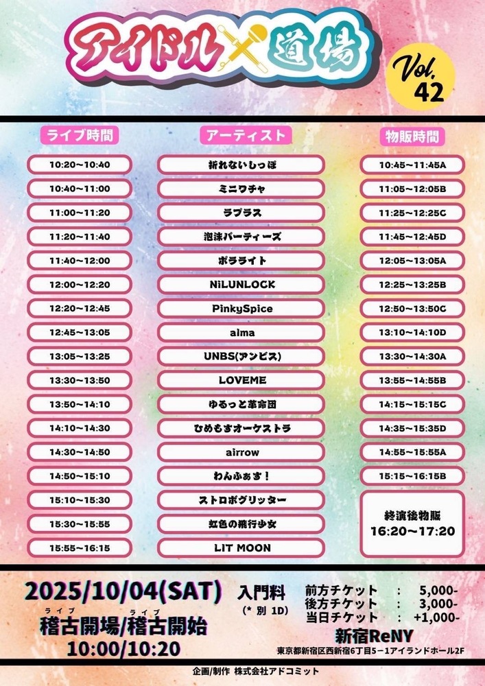 『アイドル道場 Vol.42』 SCHEDULE 2025/10/04(土) 13:05 - 23:59 新宿ReNY Open/Start 10:30/11:00 前方チケット ¥5,000- 一般チケット ¥3,000- 🎤出演13:05-(20) 👑特典会13:30-14:30 🎁入場特典 コメント付き2ショットチェキ チケット URLをコピーする 報告する