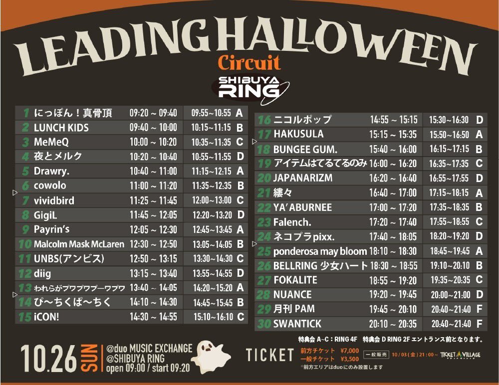『LEADING Circuit HELLOWEEN』 SCHEDULE 2025/10/26(日) 12:50 - 23:59 SHIBUYA RING ■料金:別途1D ・前方:¥7,000 ・一般:¥3,500 🎤出演12:50-(25) 👑特典会13:30-14:30 チケット URLをコピーする 報告する