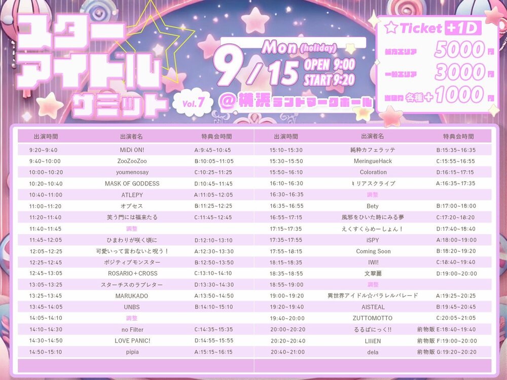 『スターアイドルサミット vol.7』 SCHEDULE 2025/09/15(月) 13:45 - 23:59 横浜ランドマークホール ■開場/開演:9:00/9:20 ■通常エリアチケット:3,000円 ■前方エリアチケット:5,000円 ■当日チケット:各種+1,000円 ※各種+別途1ドリンク ■再入場:可能(1D必須) 🎤出演13:45-(20) 👑特典会14:10-15:10 チケット URLをコピーする 報告する