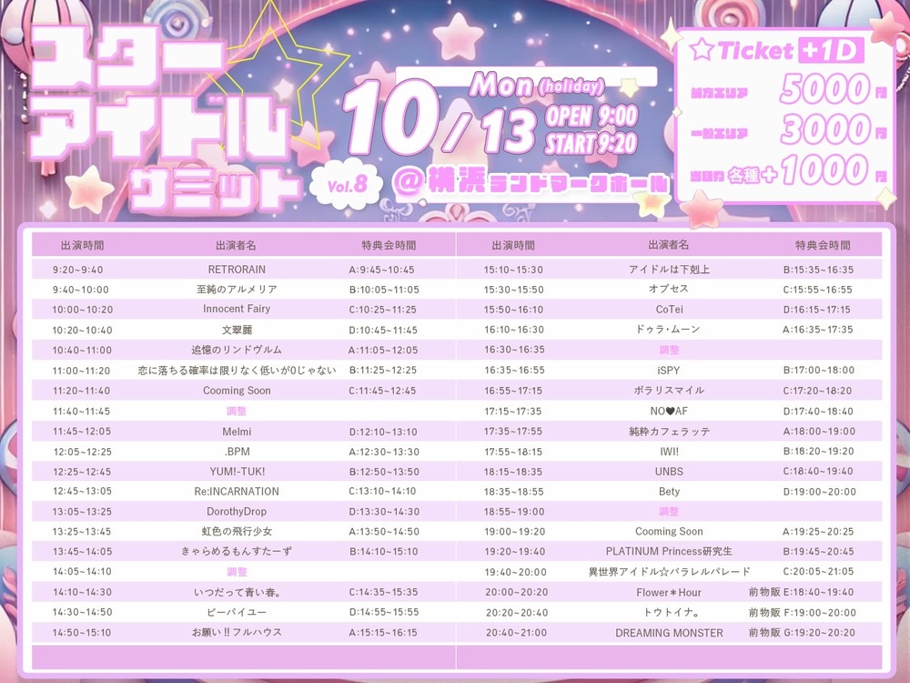 「スターアイドルサミット vol.8」 SCHEDULE 2025/10/13(月) 18:15 - 23:59 横浜ランドマークホール ■開場/開演:9:00/9:20 ■通常エリアチケット:3,000円 ■前方エリアチケット:5,000円 ■当日チケット:各種+1,000円 ※各種+別途1ドリンク 🎤出演18:15-(20) 👑特典会18:40-19:40 チケット URLをコピーする 報告する