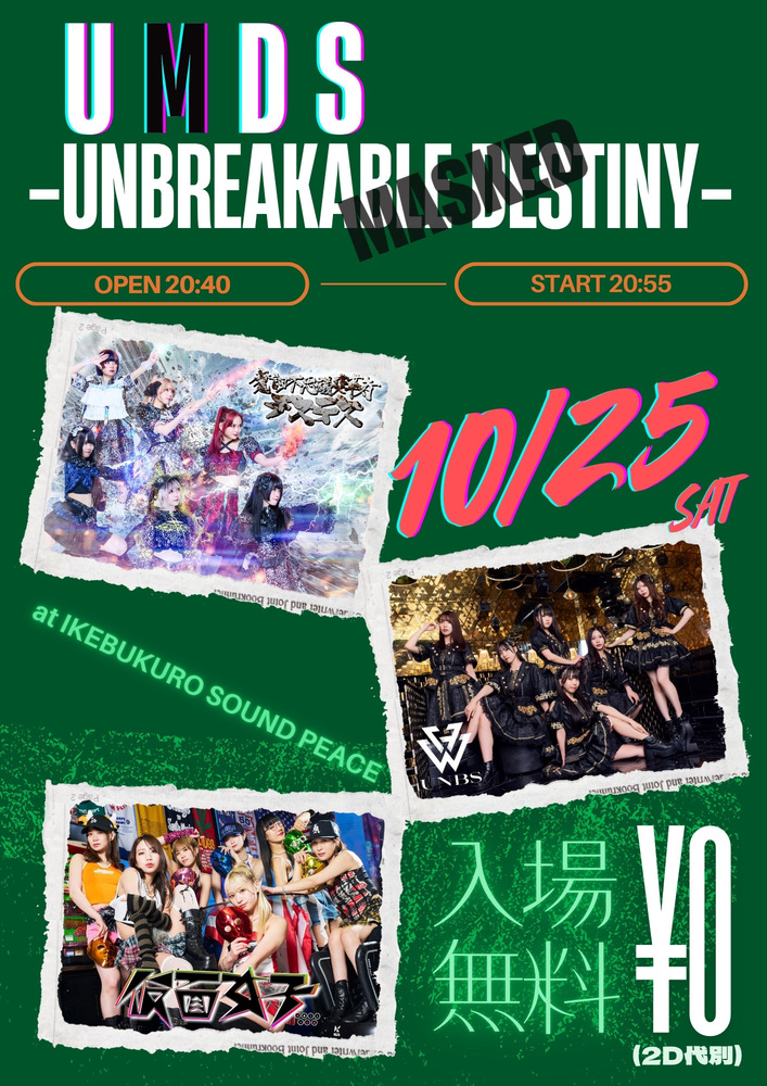 『UMDS -UNBREAKABLE "MASKED" DESTINY-』 SCHEDULE 2025/10/25(土) 20:55 - 23:59 池袋サウンドピース OPEN 20:40 / START 20:55 前方優先 ¥2,000 / 通常一般 ¥0 / 当日 各 +¥500 (各2D代別) 🎤出演20:55-(25) 👑特典会出番後 チケット URLをコピーする 報告する