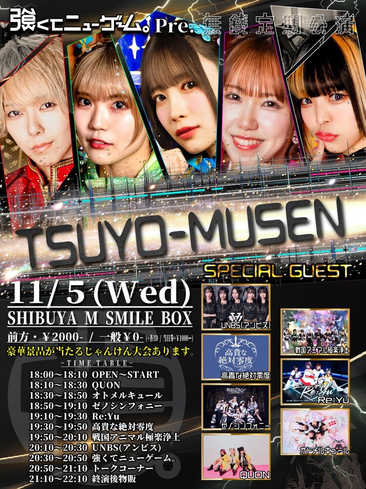 「TSUYO-MUSEN」 SCHEDULE 2025/11/05(水) 20:10 - 渋谷アムスマイルボックス OPEN 18:00 / START 18:10 前方¥2000/一般¥0/当日+¥1000(+1D) 🎤出演20:10-(20) 👑特典会終演後21:10-22:10 チケット URLをコピーする 報告する
