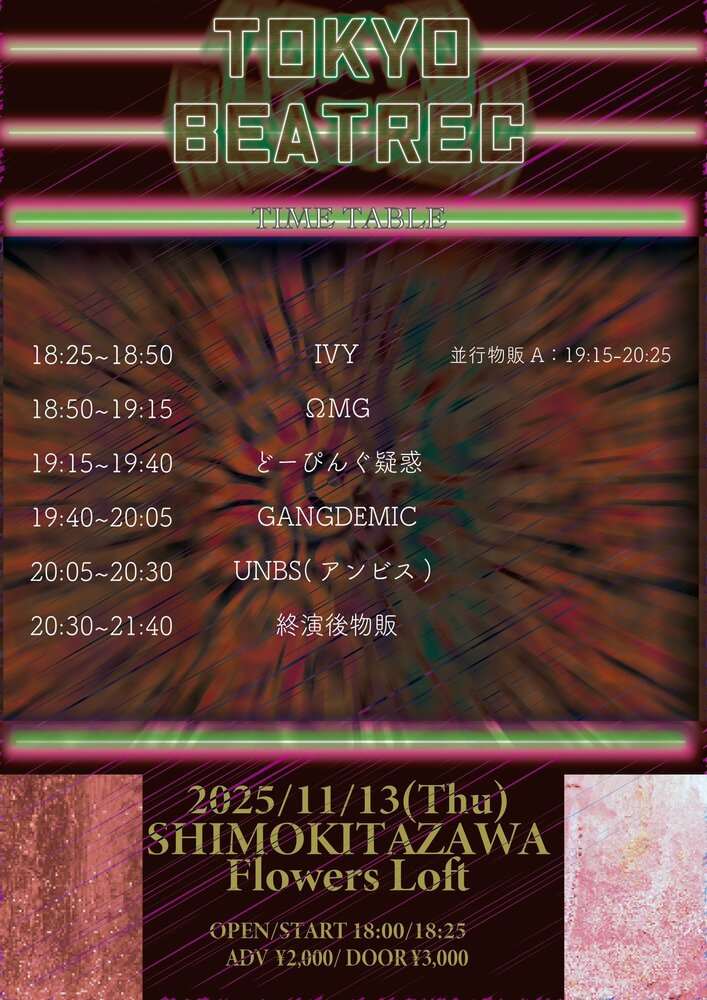 『TOKYO BEATREC』 SCHEDULE 2025/11/13(木) 20:05 - 23:59 下北沢Flowers Loft OPEN 18:00 / START 18:25 ・前売 ¥2,000 ・当日¥3,000 🎤出演20:05-(25)👑特典会終演後20:30-21:40 チケット URLをコピーする 報告する