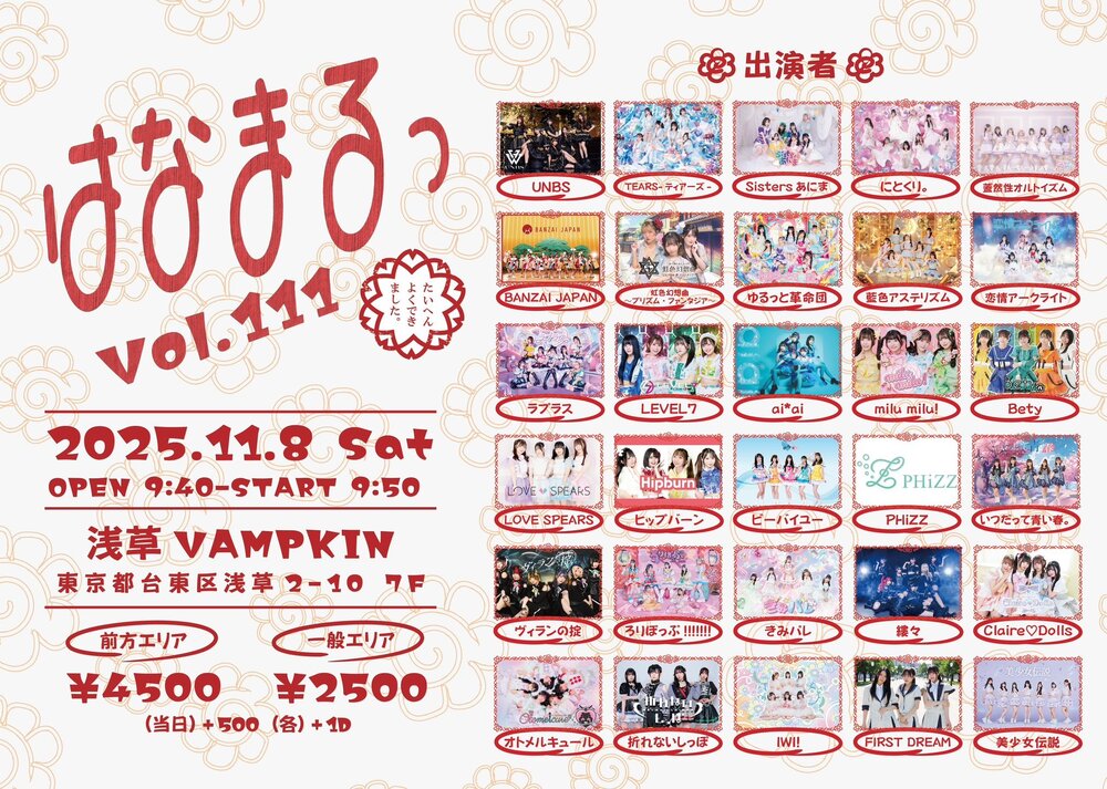 「はなまるっ Vol.111」 SCHEDULE 2025/11/08(土) 浅草VAMPKIN 開場0940 開演0950 前方エリア4,500円 一般2,500円(別途1D) 当日各+500円 チケット URLをコピーする 報告する