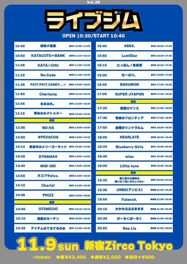 「ライブジム 第39弾」 SCHEDULE 2025/11/09(日) 19:35 - 23:59 新宿Zirco Tokyo 前方3000円/通常2000円/当日+500円(各1D) 🎤出演19:35-(20)👑特典会21:05-22:05 チケット URLをコピーする 報告する
