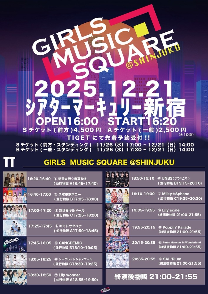 『 GIRLS MUSIC SQUARE @新宿 』 SCHEDULE 2025/12/21(日) 18:50 - 23:59 シアターマーキュリー新宿 開場16:00 開演16:20Sチケット(前方)4,500円 Aチケット(一般)2,500円 (各1D別) 🎤出演 18:50-19:10(20)👑特典会 19:15-20:10(B) チケット URLをコピーする 報告する