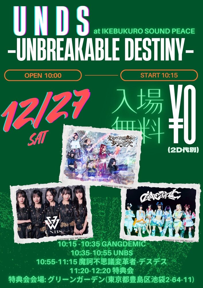 『UNDS -Unbreakble- Destiny-』 SCHEDULE 2025/12/27(土) 10:35 - 23:59 池袋サウンドピース 📍OPEN 11:00 / START 11:15🎟️¥0- / 2D別 🎤出演10:35-10:55(20)👑特典会終演後11:20-12:20 チケット URLをコピーする 報告する