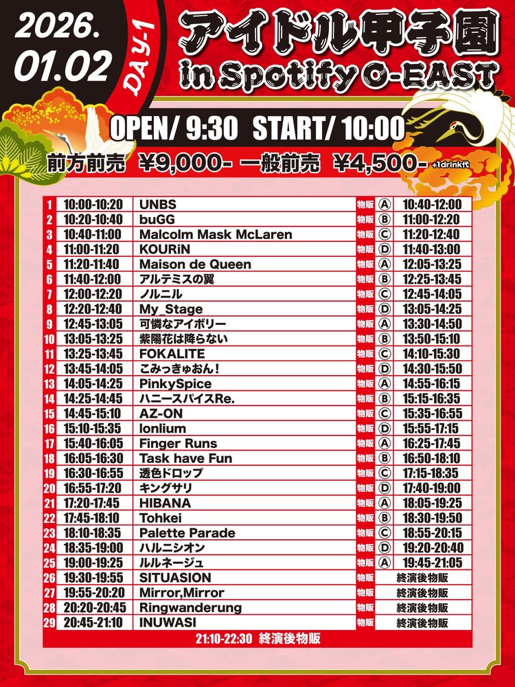 「アイドル甲子園 in Spotify O-EAST」 -DAY1- SCHEDULE 2026/01/02(金) 10:00 - 23:59 Spotify O-EAST OPEN9:30START10:00 前方(前売り)¥9,000前方(当日)¥10,000一般(前売り)¥4,500一般(当日)¥5,500 🎤出演10:00-(20)👑特典会10:40-12:00 チケット URLをコピーする 報告する