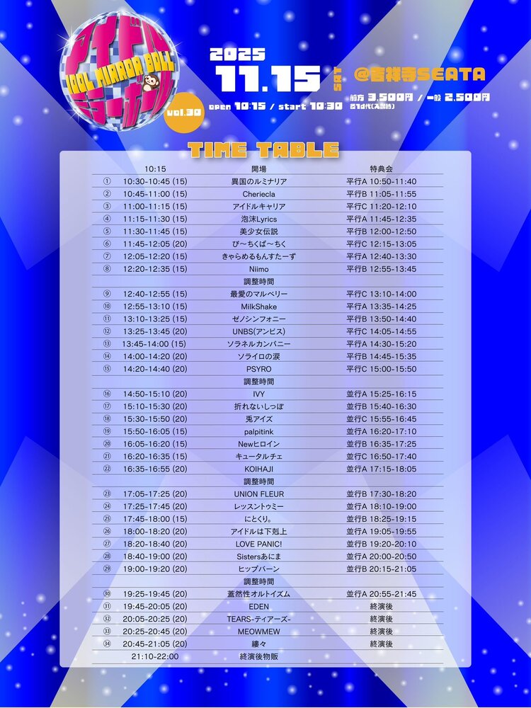 『アイドルミラーボール』 SCHEDULE 2025/11/15(土) 13:01 - 吉祥寺SEATA OPEN 10:15 / START 10:30 前方¥3500/一般¥2500/当日各+¥500(1D別) 🎤出演13:25-(20) 👑特典会14:05-14:55 チケット URLをコピーする 報告する