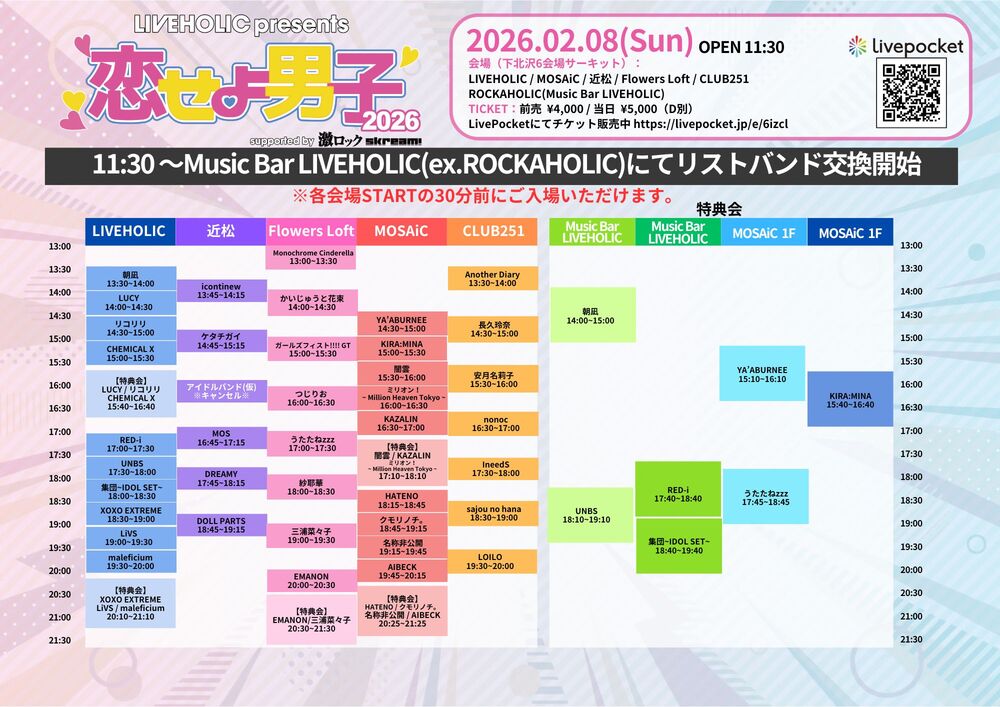 "恋せよ男子2026" supported by 激ロック & Skream! SCHEDULE 2026/02/08(日) 17:30 - 23:59 下北沢LIVEHOLIC 前売り¥4,000 / 当日¥5,000(D代別) 🎤出演17:30-18:00(30)👑特典会18:10-19:10 チケット URLをコピーする 報告する
