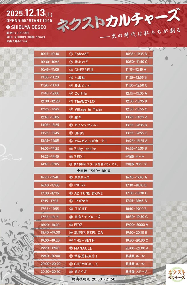 「ネクストカルチャーズ 」 SCHEDULE 2025/12/13(土) 13:25 - 23:59 SHIBUYA DESEO 開場9:55/開演 10:15前売り¥2,500-/当日¥3,000- 🎤出演13:25-(20)👑特典会13:55-14:55 チケット URLをコピーする 報告する
