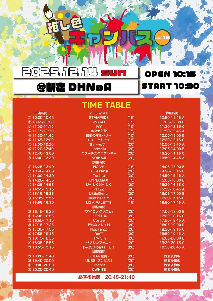 【推し色キャンバス vol.16】 SCHEDULE 2025/12/14(日) 19:40 - 23:59 新宿DHNoA 開場10:45 開演11:00 料金:前方3500円 / 一般2500円 /当日各+500 (入場時1ドリンク必須) 🎤出演19:40-(20)👑特典会終演後20:45-21:40 チケット URLをコピーする 報告する
