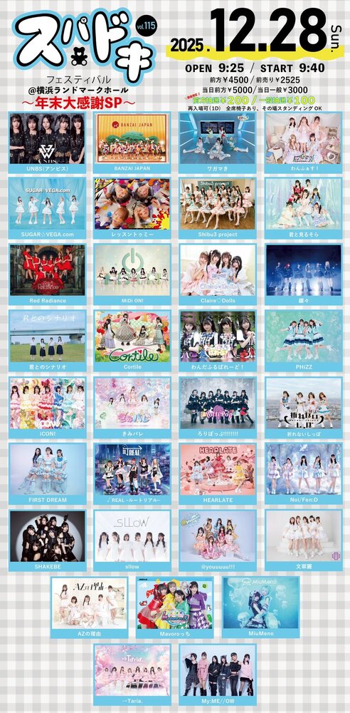 【スパドキフェスティバルVol.115~年末大感謝SP~】 SCHEDULE 2025/12/28(日) 横浜ランドマークホール 前方エリア4500円/一般エリア2525円(当日前方5,000円、当日一般3,000円)各チケット別途1D ※チケット発売11/29(土)23:00 チケット URLをコピーする 報告する