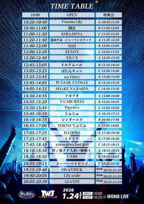 『夢より素敵な×IDOL WORLD JUMP』 SCHEDULE 2026/01/24(土) 18:30 - 23:59 渋谷WOWB 🕰️OPEN 10:00 / START 10:20 🔔料金前方 前売 ¥5,000 / 当日 ¥6,000一般 前売 ¥2,500 / 当日 ¥3,500※別途1D 🎤出演18:30-18:50(20)👑特典会18:55-19:55 チケット URLをコピーする 報告する