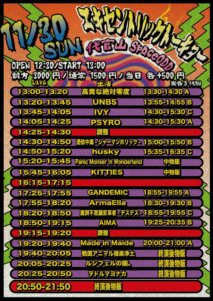 『エキセントリックトーキョー』 SCHEDULE 2025/11/30(日) 13:20 - SPACE ODD OPEN12:30 / START 13:00予約:¥1500(D代別)/当日:各+¥500(D代別)/前方優先:¥3000 🎤出演13:20-(25)👑特典会13:55-14:55 チケット URLをコピーする 報告する