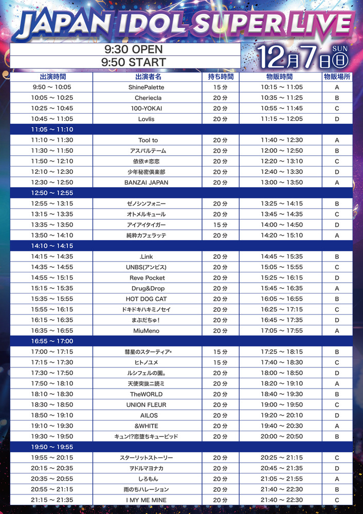 「JAPAN IDOL SUPER LIVE 2025」@飛行船シアター 初冬の陣編 powered by ULTRA FES SCHEDULE 2025/12/07(日) 14:35 - 飛行船シアター 開場:9:30 開演:9:50(予定)一般3,000円 前方優先5,000円 各D別 🎤出演14:35-(20)👑特典会15:05-15:55 チケット URLをコピーする 報告する