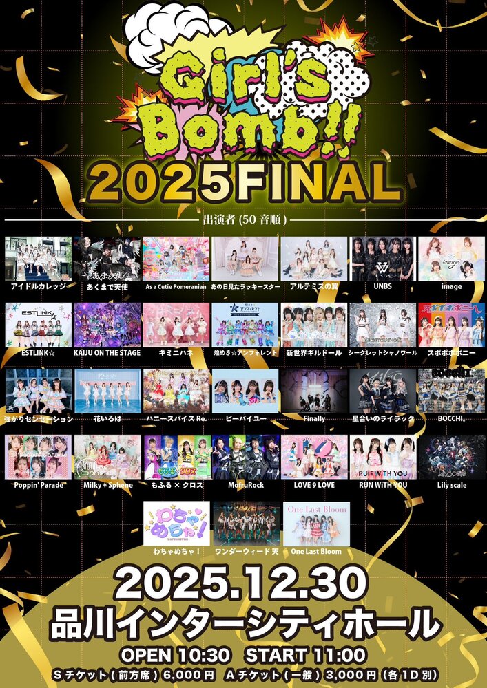 『Girl’s bomb!! 〜2025FINAL〜』 SCHEDULE 2025/12/30(火) - 2025/12/31(水) 品川インターシティーホール OPEN 10:30 / START 11:00 Sチケット(前方席) ¥6,000 Aチケット(一般) ¥3,000 (各1D別) チケット URLをコピーする 報告する