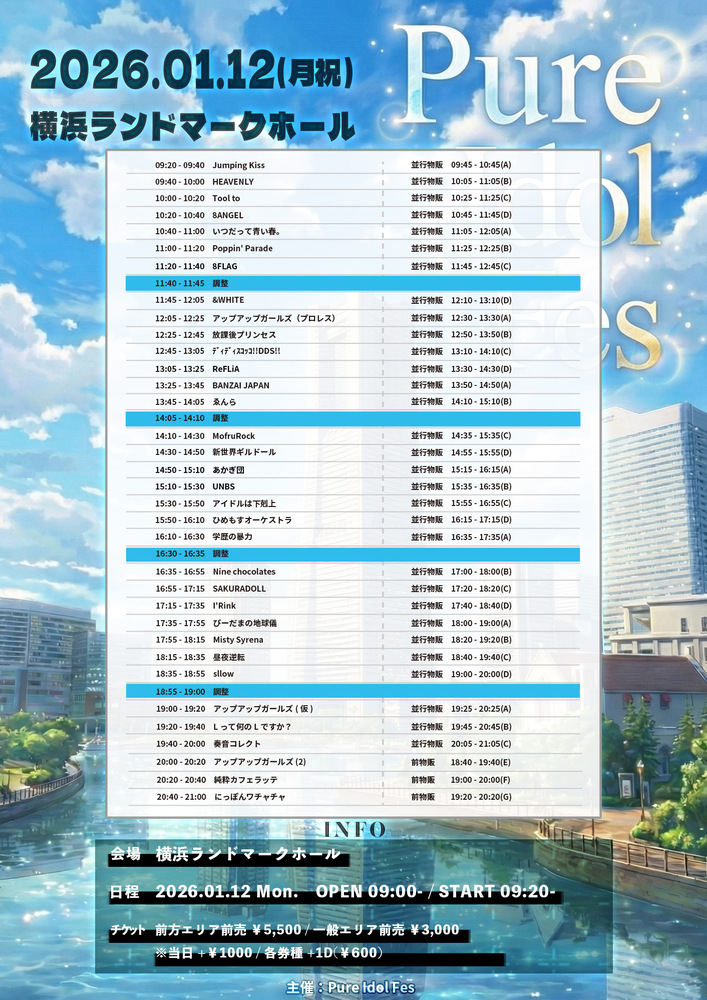 『Pure IDOL Fes vol.1』 SCHEDULE 2026/01/12(月) 15:10 - 23:59 横浜ランドマークホール ■開場/開演:9:00/9:20 ■通常エリアチケット:3,000円■前方エリアチケット:5,500円■当日チケット:各種+1,000円 🎤出演15:10-(20)👑特典会15:35-16:35 チケット URLをコピーする 報告する