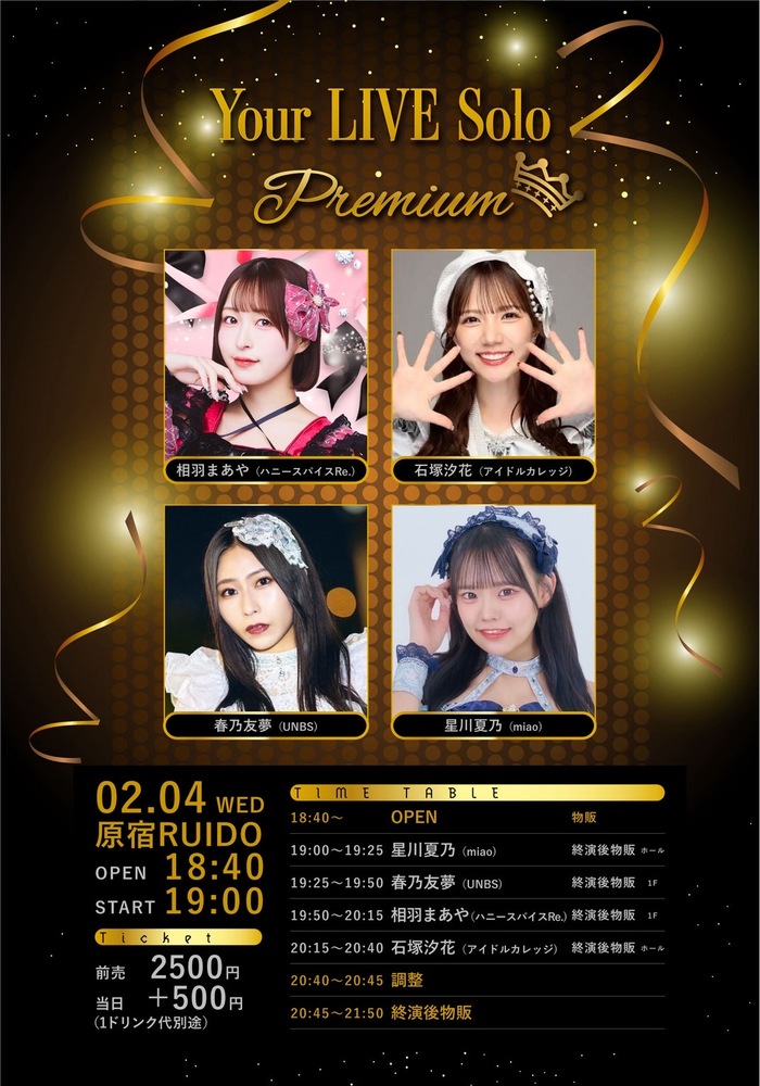 『Your LIVE solo Premium』(春乃友夢ソロ) SCHEDULE 2026/02/04(水) 19:25 - 23:59 原宿RUIDO ⏰OPEN 18:40 / START 19:00 🔔料金(別途1D)前売 ¥2,500 / 当日 +¥500 🎤出演19:25-19:50(25)👑特典会終演後20:45-21:50 チケット URLをコピーする 報告する