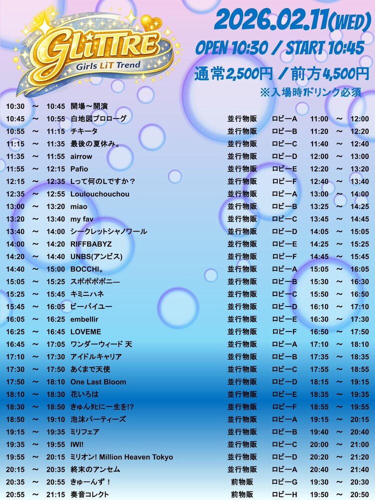 『GLiTTRE〜Girl’s LiT Trend〜』 SCHEDULE 2026/02/11(水) 14:20 - 23:59 時事通信ホール ⏰OPEN 10:30 / START 10:45 🔔Sエリア ¥4,500 / Aエリア ¥2,500※別途1D(¥700) 🎤出演14:20-14:40(20)👑特典会14:45-15:45 チケット URLをコピーする 報告する