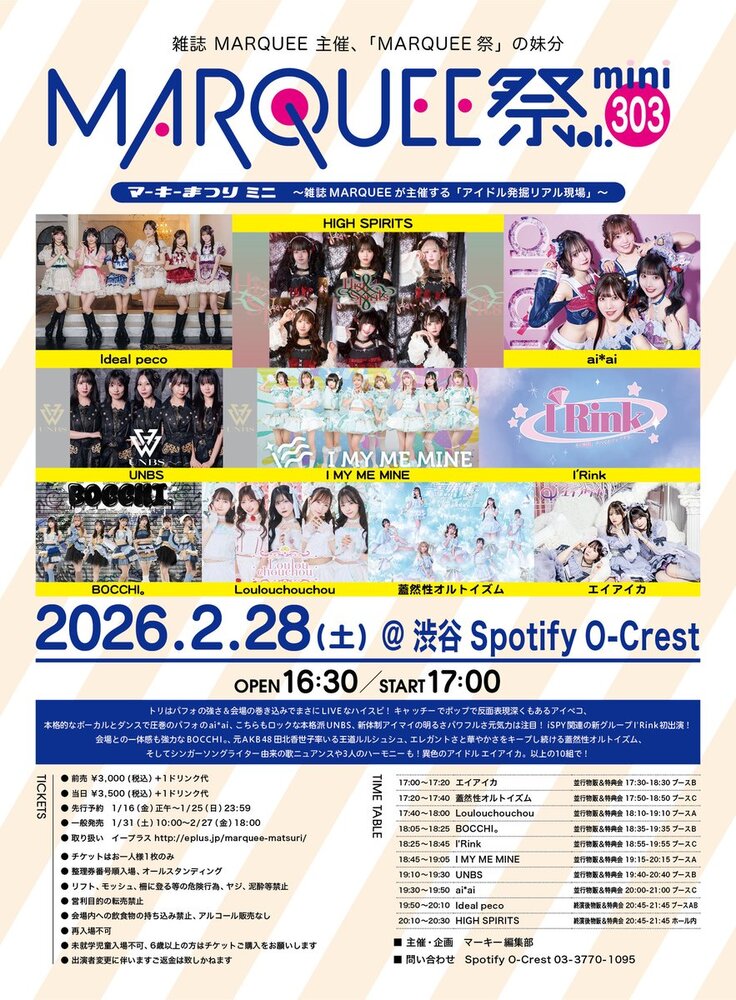『MARQUEE祭mini Vol.303』 SCHEDULE 2026/02/28(土) 19:10 - 23:59 Spotify O-crest ⏰OPEN 16:30 / START 17:00 🔔前売 ¥3,000 / 当日 ¥3,500※別途1D 🎤出演19:10-19:30(20)👑特典会19:40-20:40 チケット URLをコピーする 報告する