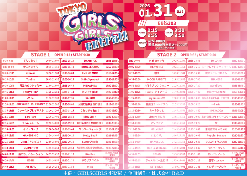 『TOKYO GIRLS GIRLS extra!!』 SCHEDULE 2026/01/31(土) 13:15 - 23:59 EBiS303 OPEN 9:00 / START 9:15前方 ¥6,000 / 通常 ¥3,000当日 各+¥1,000(入場時1D必須) 🎤出演13:15-13:35(20)👑特典会13:50-15:00 チケット URLをコピーする 報告する