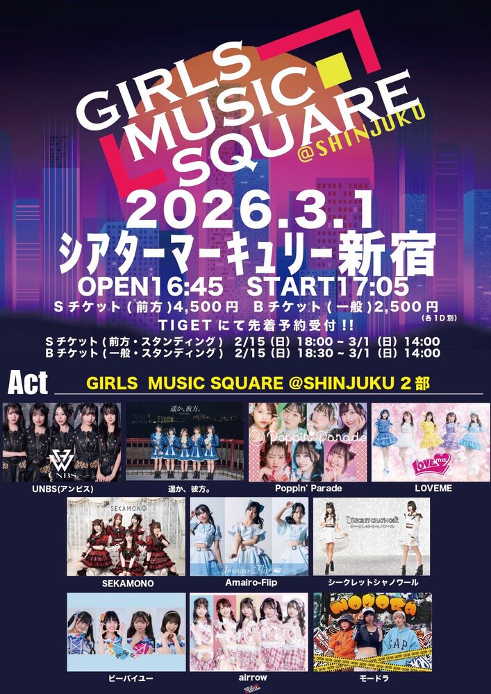 『GIRLS MUSIC SQUARE @新宿 2部』 SCHEDULE 2026/03/01(日) シアターマーキュリー新宿 🕰OPEN 16:45 / START 17:05🔔Sチケット(前方)¥4,500Bチケット(一般)¥2,500(各1D別) チケット URLをコピーする 報告する