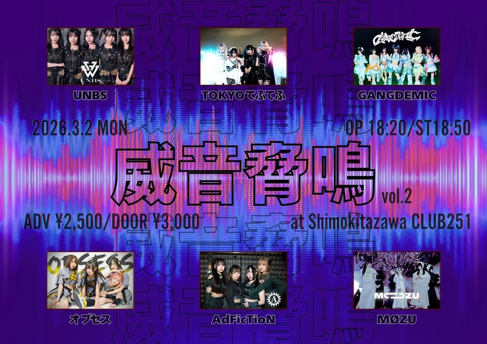 『威音脅鳴 vol.2(イオンキョウメイ)』 SCHEDULE 2026/03/02(月) 下北沢231 ⏰OPEN 18:20 / START 18:50 🔔料金前売 ¥2,500 / 当日 ¥3,000(+1D) チケット URLをコピーする 報告する