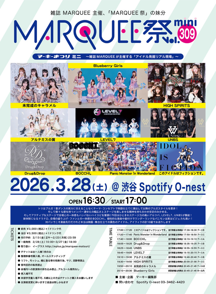 「MARQUEE祭mini Vol.309」 SCHEDULE 2026/03/28(土) 18:25 - 23:59 Spotify O-nest ⏰OPEN 16:30 / START 17:00 🔔料金前売 ¥3,000 / 当日 ¥3,500(各+1D・税込) 🎤出演18:25-18:45(20)👑特典会18:55-19:55 チケット URLをコピーする 報告する